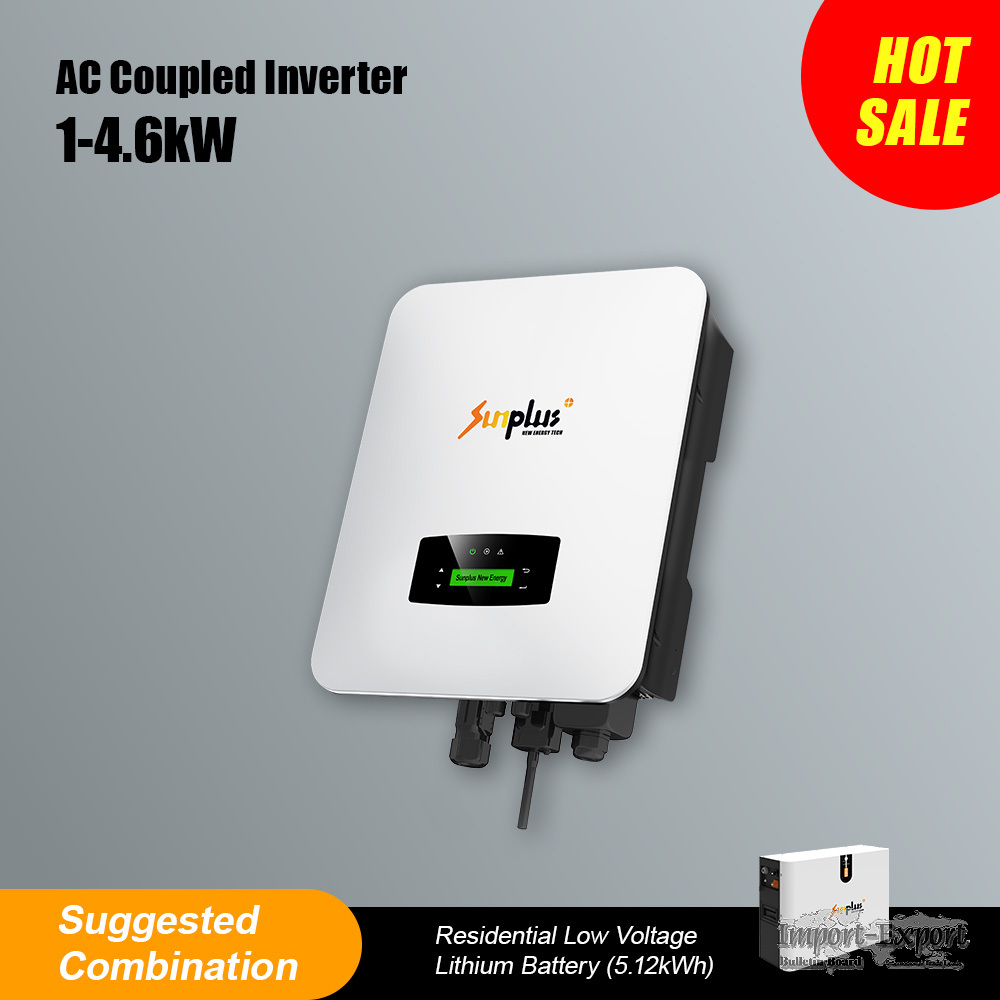 1-4.6kW AC Coupled Inverter Product Description Sunplus AC Coupled Inverter (1kW-4.6kW) suitable for both single-phase & three- phase systems. It can be fitted alongside string inverter, enabling you to upgrade to solar battery storage system without changing your current installation. AC Coupled Battery Inverter Solution An ac coupled battery inverter is perfect if you have an existing photovoltaic array and want to add energy storage. It's simple - AC coupling uses a normal solar inverter coupled to a battery inverter/charger to manage the battery storage unit. In an AC-coupled system, the DC power from the PV array is first converted to AC by the PV inverter and then used to power the AC load panels. Any unused energy is directed by the inverter/charger to charge the storage unit. In a grid-tied system, when the grid fails, the inverter/charger isolates the base load panel and PV inverter from the grid through an internal transfer switch. This allows the PV array to generate electricity even during grid outages. An AC-coupled setup is simple and powerful, but charging is slightly less efficient than a DC-coupled solution. However, they are very efficient at powering AC loads during the day and can be expanded with multiple solar inverters to form a microgrid.