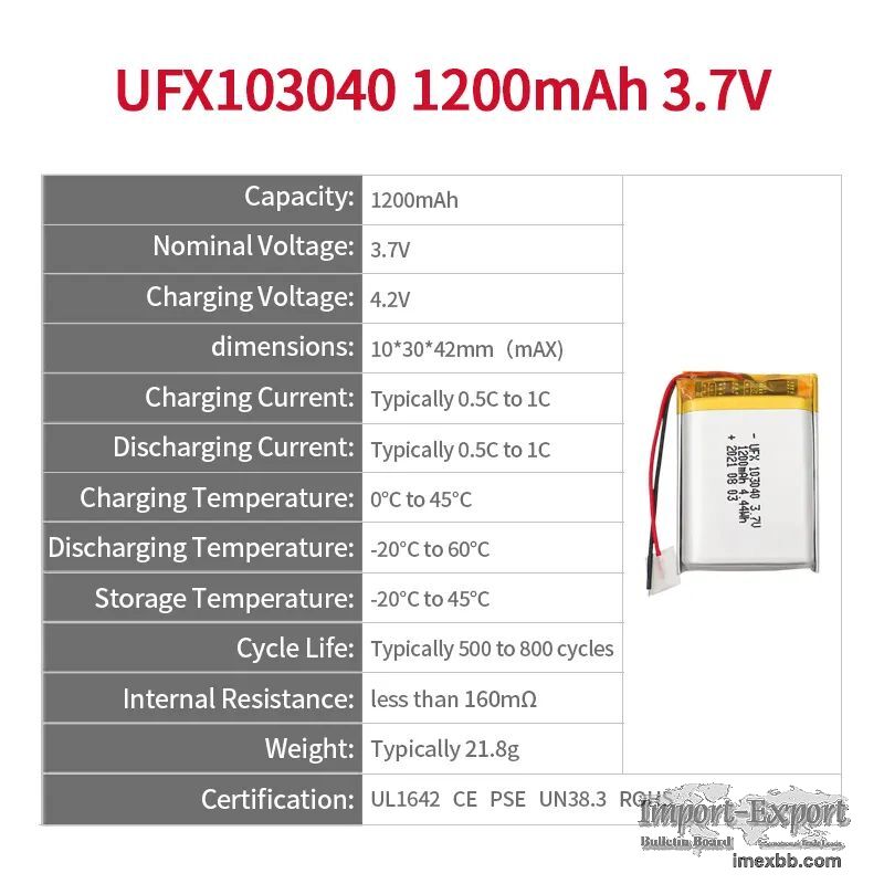 Brand Name: UFX Model Number: 103040 Battery Size: 10*30*42mm Weight: Typically 21.8g Capacity: 1200mAh Nominal Voltage: 3.7V Charging voltage: 4.2V Charging Temperature: 0℃ to 45℃ Discharging Temperature: -20℃ to 60℃ Cycle Life: Typically 500 to 800 cycles