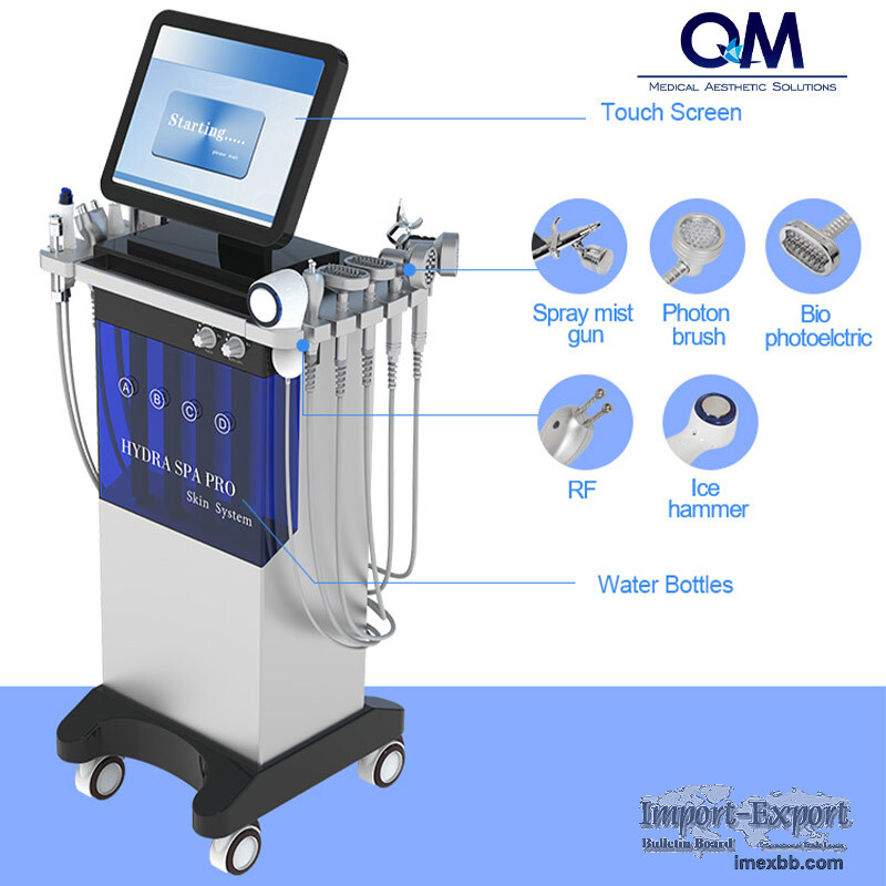 Technical Specifications Item:14 in 1 Hydra Facical Care Machine Model:QM-690 Vacuum:90Kpa Max output:250VA Power:300W Screen:15 inch Touch screen Ultrasound:1MHz RF:5MHz High frequency: 50Hz-60Hz Voltage :100-240VAC, 50Hz/60Hz Handle: 4 Hydrodermabrasion with8tips / Hydrodermabrasion with9diamond tips; Spray mist gun 1piece; RF 1 piece; Three polar RF 1 piece; High frequency handle 1 piece, Ultrasound handle 2 pieces; Bio photoelctric 2 pieces; Skin scrubber 1 piece; Photon Brush 2 pieces