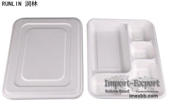 Biodegradable sugarcane bagasse food container 5 Compartments Tray This food packaging tableware is made of bagasse, a waste pulp from sugarcane plants. This durable tray is 100% compostable and environmentally friendly. Because the sugarcane plants are domestically-grown and annually renewable, so by using this product your business encourages environmental sustainability.