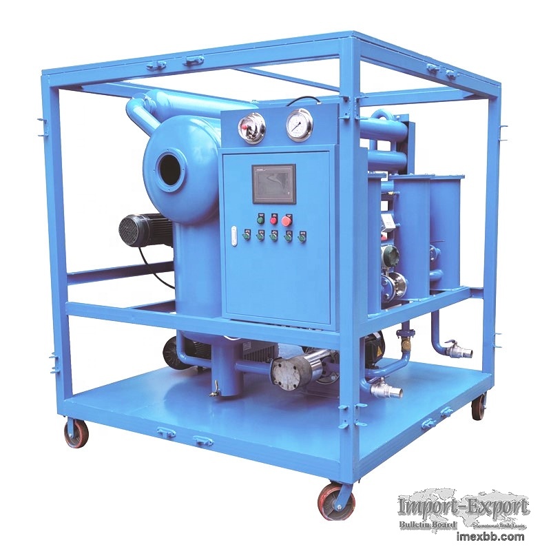 ZYD Double-stage transformer oil purifier can quickly remove water, trace water, gas, particles as well as acetylene, hydrogen, methane and other harmful ingredients from oil effectively to improve oil's dielectric strength, effectively making sure electric equipments working safely and normally. Series ZYD oil purifier is particularly suitable for treating high- grade transformer oil, super-voltage transformer oil and new transformer oil. It can be used for filtration of more than 110V substation live line work onsite. Meanwhile, Series ZYD oil purifier can be used as independent vacuum source with functions of vacuum drying and vacuum oiling. Features: 1. Double-stage vacuum system, strong power of vacuum evacuating, ultimate vacuum value ≤ 5Pa. 2. Two vacuum separating chambers, efficient oil film sprayer, increasing separating size and separating time to ensure the dry-level and dielectric strength improving greatly. 3. Duplex-Stereo film evaporation technology, combined with unique and advanced dewatering, degassing components, can rapidly and effectively separate water, gas from oil. 4. Multi-stage precision filtration system, mesh filtration combined with molecular adsorption technologies. 5. Efficient electric heating system, heating uniformity, less power consumption, safe, and reliable. 6. Double-stage liquid level sensor, pressure protective system to ensure machine operation easy and safely. 7. Adopt interlocked protective system, which connect oil pump, heater and liquid level sensor, avoiding blank heating, blank pumping, oil leak and electricity leak. If there is any fault, machine will be power off automatically. 8. Functions of live line work onsite, vacuum drying and vacuum oil filling.