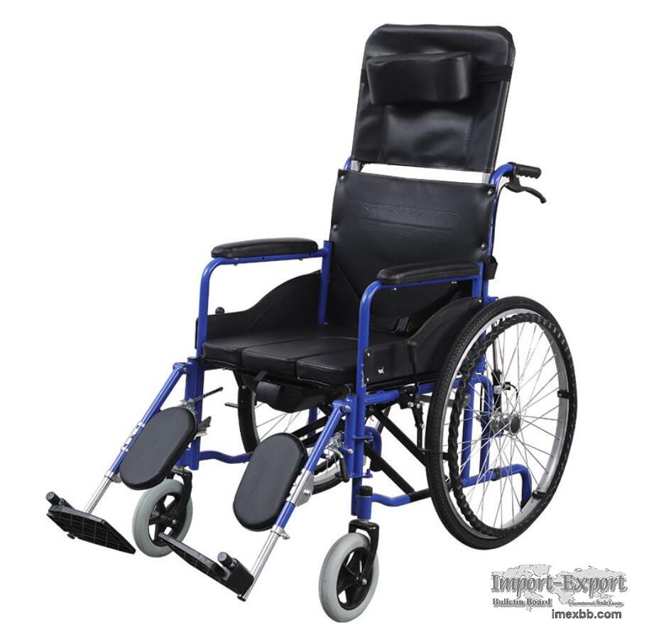 The high back manual wheelchair is a reclining, high strength, lightweight wheelchair in a class of its own. The tilt range is ninety to one hundred and eighty degrees. The compact foldable design makes the ultra-light reclining wheelchair ideal for storage or transport. Lightweight wheelchairs for outdoor use are also very sturdy for your comfort and convenience. Features of high back manual wheelchair 1. Half/full lying wheelchair integrated, hydraulic control 90-180 comfortable all lying, can be adjusted at will without gear limit; 2. Leather seats are easy to clean, good air permeability, odor free; 3. Upgrade ABS integrated wheel, easy folding easy to carry; 4. 8 inch thickened steel front fork and high density material wheel, 24 inch free inflatable wheel, 360 flexible steering, thickened material; 5. Thickened carbon steel material, frame integrated welding, 2mm wall pipe thickness, 100KG load; 6. Frame bottom double layer cross frame, more stable body, climbing, side sliding design; 7. U type suction hole extraction method, open can make. High back manual wheelchair specs Product Name: All-Lying High Back-Leaning Manual Wheelchair Frame Material: steel pipe frame Product Size: 1200 * 1000 * 670mm Width: 970 * 300 * 530mm Position Surface Height: 560mm Armrest Height: 720mm Position Face Width: 450mm Position Surface Depth: 440mm Backrest Height: 670mm Weight Bearing: 100 kg Solid Front Wheel: 8 inches Solid Rear Wheel: 24 inches