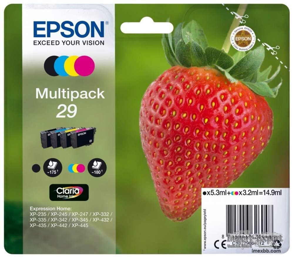 Rich and vivid, the pigment-based and dye-based Claria Home Ink in these cartridges creates professional-looking documents in seconds, making this pack ideal for business use. High-quality and high-value, this Epson Claria 29 black and colour cartridge multipack makes it easy to print crisp, clear photographs at home. Part number c13t29864010. Colours included: black, cyan, magenta, yellow. Ink cartridge capacity 14.9ml. Suitable for use with: XP-235 / XP-332 / XP-335 / XP-432 / XP-435 / XP-245 / XP-342 / XP-345 / XP-442 / XP-445 / XP-247 / XP-257 / XP-255 / XP-352 / XP-355 / XP-452 / XP-455. EAN: 8715946602332.