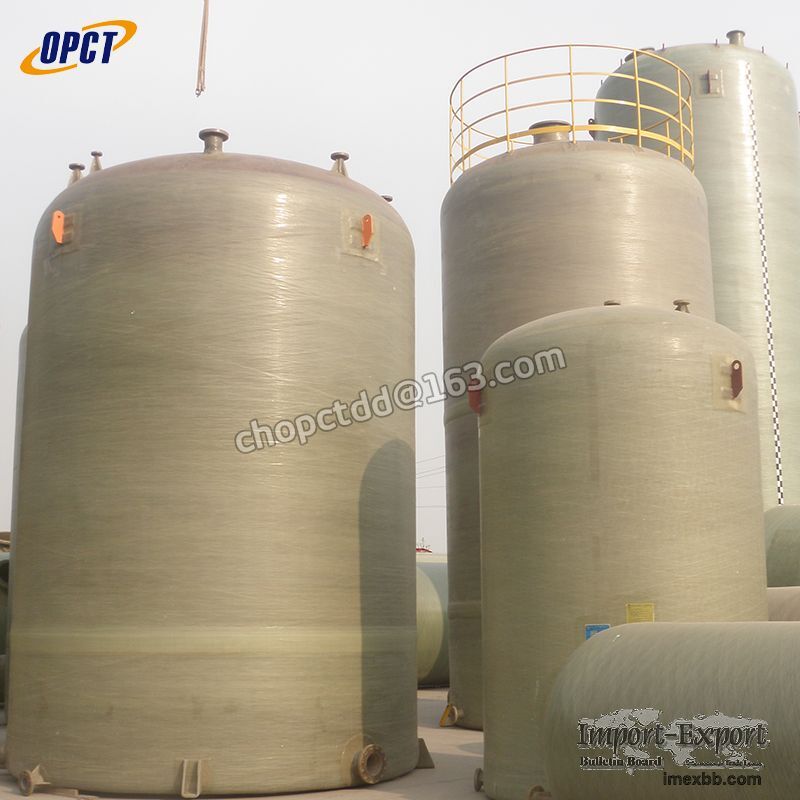 FRP chemical storage tank (also known as FRP chemical storage vessel), is manufactured by filament winding process and designed to store high corrosive chemicals like acids, alkalis, alcohols, mineral oils and esters. It can used at high temperature, under high pressure and performs well in preventing seepage, leakage and overflowing. We offer FRP storage tanks in various dimensions and colors to meet your requirements. In addition, FRP chemical storage tanks can also be offered with suitable agitators, ladder, gear box, electric motor and other accessories. FRP chemical storage tank can prevent seepage, leakage and overflowing No. Volume (m3) Size(mm) DN*Height Medium Weight (kg) Temperature (℃) 1 10 Φ2000*3700 Dilute sulfuric acid 750.7 0-60 2 20 Φ2500*4700 Dilute nitric acid 1036.4 0-60 3 30 Φ3000*5000 Sodium silicate 1644.8 0-60 4 45 Φ3500*5200 Ammonium sulfate 2380.9 0-60 5 60 Φ3800*5600 Hydrochloric acid 3117 0-60 6 70 Φ4000*6500 Caustic soda 3725.6 0-60 7 100 Φ4000*8500 Sulfuric acid 5197.2 0-60 8 230 Φ5500*9280 Hot hydrochloric acid 12473.3 0-80 9 500 Φ9000*10512 Hydrochloric acid 24905 0-60