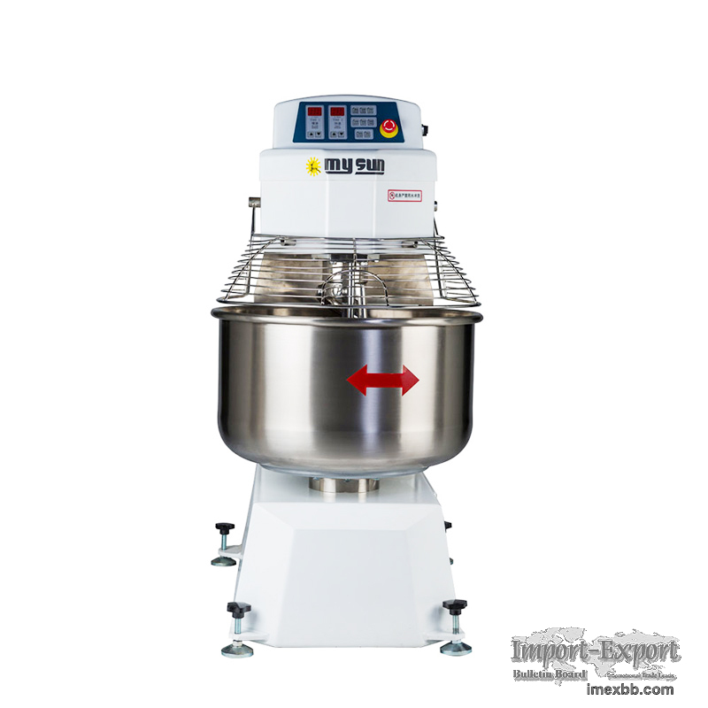 Dough Mixer Product Description The MYSUN dough mixer has different models: Fixed bowl type and self-tipping bowl-lifted type. The fixed bowl type dough mixer is the classical and hot-sale type,welcomed by most clients. The self-tipping spiral dough mixer is suitable for the continuous big-scale production line,can save the labor who take the dough out of bowl. This is the special design which can lift bowl automatically. Dough Mixer Characteristic: (1) Heavy and strong painted steel feet to fix the dough mixer on ground stably. (2) All parts touched food are stainless steel, The mixing bowl made of food- grade stainless steel, Center pole and hook adopts the 630 food-grade stainless steel. (3) Two independent motors for spiral and bowl. (4) The control panel are double model: digital and manual, can avoid the suspending work due to the panel broken, to improve the work efficiency greatly.