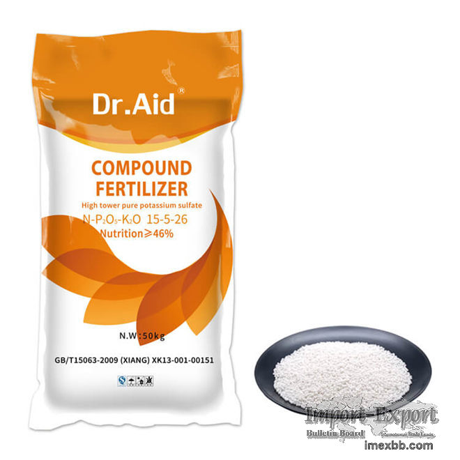 NPK water soluble fertilizer 15-5-26 Description Brand: Dr.Aid HS CODE: 3105909000 Nutrition: 46% NPK Ratio: 15-5-26 Product Name: Sulfur-Based Compound NPK Fertilizer Formula: N-P2O5-K2O Chloride:<3% Nitrogen:>13.5%< , br>Phosphorus Pentoxide:>4.0% Potassium oxide:>24.5% Melting point:70℃ State:Granular fertilizer Colour white, red, yellow, OEM color Granular size 2-5mm Moisture content <2%
