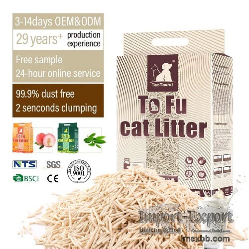 Biodegradable and 100% natural plant cat litter Tofu litter includes bar tofu and millet broken tofu litter Product Description This is a vacuum packaging, smells of milk, using natural plant raw materials, cats can eat at ease. Natural raw materials, so that the cat can rest assured, the strip of fine particles wrapped better, solve the problem of ordinary tofu cat litter on cat feces wrapping ability is poor, deodorization effect is better, effectively inhibit odor. In addition, activated carbon is added to effectively deodorize and purify the air while making the environment more comfortable. Product Features and Advantages * 2s quickly clumping * Natural pea flavor and activated carbon double adsorption * Environmentally friendly fast caking * 99% dust free * Soluble in water, water can be degraded Production Process and Technology We have a professional tofu factory, specializing in the production of tofu cat litter imported machines, daily production of tens of thousands of tons, can produce different particles, different tastes of cat litter, of course, we can also customize different diameters of cat litter, as well as the content of added flavor. Our aim is to achieve complete customer confidence, satisfaction.