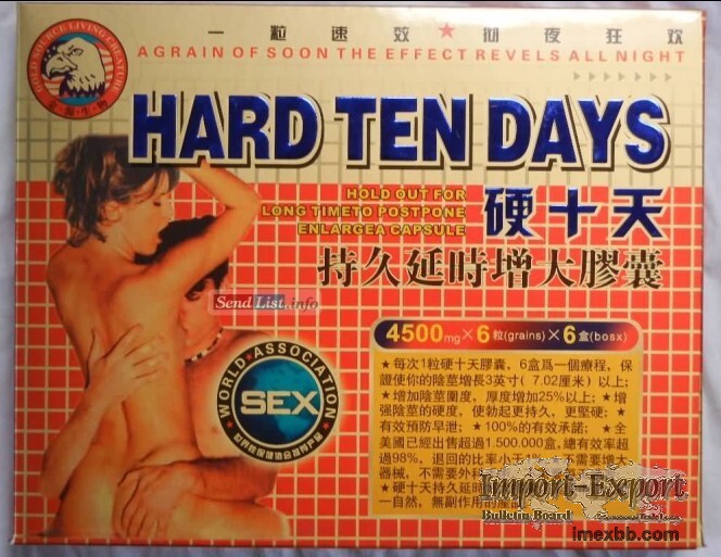 Hard Ten Days 4500mg CapsuleBest Products online Buy Online without Prescription FedEx Overnight Ships Fast & Discrete US Pharmacy African Black Ant, Germany Black Ant, Black Ant King, Germany Black Gorilla, DRAGON XXX 10 Caps, Chinese Niubian / Obama Pills, Extenze for Men, Gold Viagra, Golden Root Male, Gold Rhino for Men Pills, Hammer Stroke for Men, Hard Ten Day Pills, Hard Steel Honey, Herb Viagra, Hu Hu Male Pills, Lang Yi Hao Wolf Pills, Magnum 24K Pills, MACA Strong Man Pills, Magnum 9800 Pills, Maxman Pills, Top Vigra Pills, Tiger King for Men, USA Black Gold Male Pills, Tibet Babao Male Supplement, Vigour 800mg for Men, V9 Pills 1, USA Wolf Brother Pills for Men, Rhino Pills 11 Series 25000, Rhino Pills for Men. Minimum Order: 100 packs SOURCE: Import-Export Bulletin Board (https://www.imexbb.com/)