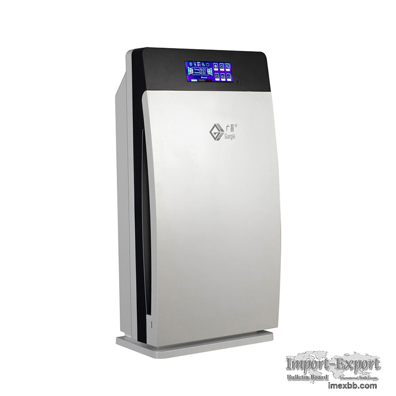 Features: UVC Air Purifier with 6 layers purification filter systerm with PP prefilter,HEPA, double active carbon, cold catalyst, and Photocatalyst function ┃ 500mg/h Ozone Generator ┃ Anion output is 5 million/Cb.cm ┃ Light Touch Screen and dynamic Display with Temperature and humidity display┃ Air Quality sensor Features Light Touch Screen and dynamic Display Temperature and humidity display Integral seal design Air output cover auto ON/OFF with machine Hidden handle. Photo-catalyst filter with UV function UVC Air Purifier Function 6 layers purification filters: High-density cotton pre-filter, remove different kinds of pollutants which more than 20 microns, such as hair, scurf, fibre, pollen dust, etc H12 HEPA filter can remove more than 99.97& particles whose diameter is 0.03microns(about1/200 of the hair diameter ), Cold-catalyst filter can absorb and decompose formaldehyde, break down formaldehyde and other toxic gas into CO2 and H2O. Cotton carbon filter, preliminary adsorption odor. Guanglei Activated carbon filter can remove organism and pollutant, absorb and eliminate odors and toxic gas, with goods purification effect. Photo-catalyst filter, degrade toxic and harmful gases in the air, effectively kill multiple germs and remove odors and stain-resistant. etc. 5million negative ion, 30 minutes after negative ion intake, the lung is able to inhale 20% more oxygen and exhale 14.5% more carbon dioxide, they greatly benefit people's health and everyday routine, which can facilitate body growth and disease prevention. UV sterilization, kill all kinds of microoganism, germ, etc. Auto / Manual 2 Working mode.. Low / Mid / High 3 fan speed. Green / Yellow / Red 3 indicator quality indicator. 5 timer setting: 1 / 2 / 4 / 8 / 12 Hr timing can choose. Remote control support customer operate it in 10M distance. Approved CE, RoHS, FCC certificate.