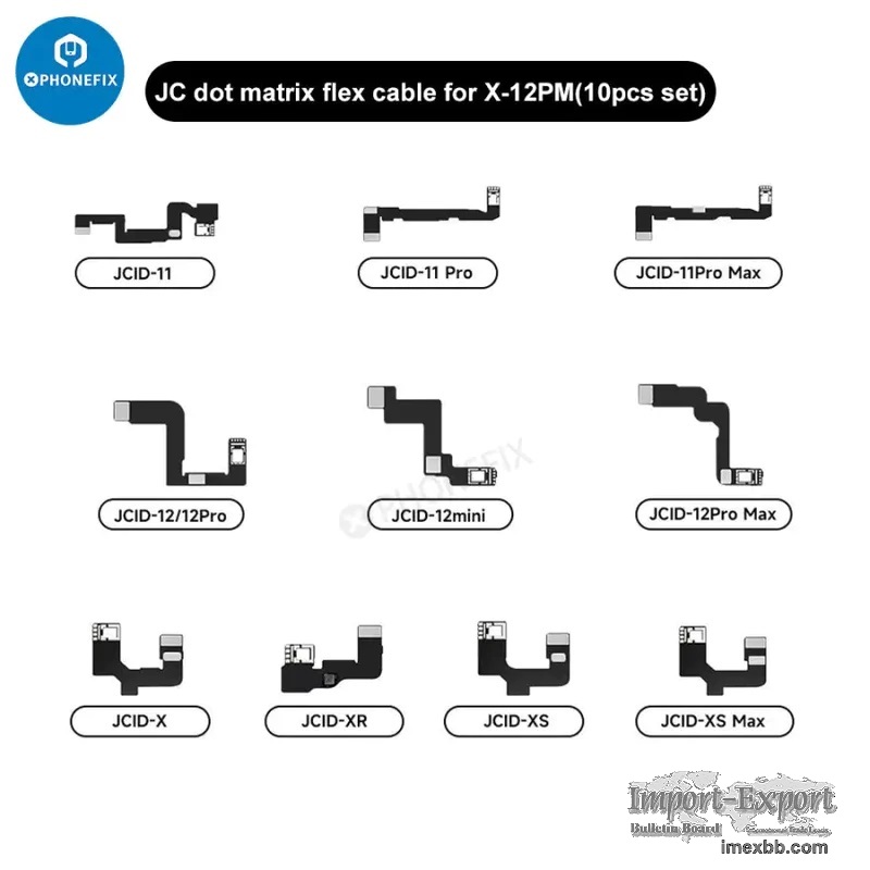 Support models: 1x JC dot matrix flex cable for iPhone X. 1x JC dot matrix flex cable for iPhone XS. 1x JC dot matrix flex cable for iPhone XS MAX. 1x JC dot matrix flex cable for iPhone XR. 1x JC dot matrix flex cable for iPhone 11. 1x JC dot matrix flex cable for iPhone 11 Pro. 1x JC dot matrix flex cable for iPhone 11 Pro Max. 1x JC dot matrix flex cable for iPhone 12/12 Pro. 1x JC dot matrix flex cable for iPhone 12 Pro Max. 1x JC dot matrix flex cable for iPhone 12 Mini. 1x JC dot matrix flex cable for iPhone 13. 1x JC dot matrix flex cable for iPhone 13 mini. 1x JC dot matrix flex cable for iPhone 13 Pro/13 Pro Max. 1x JC dot matrix flex cable for iPad 3/4.