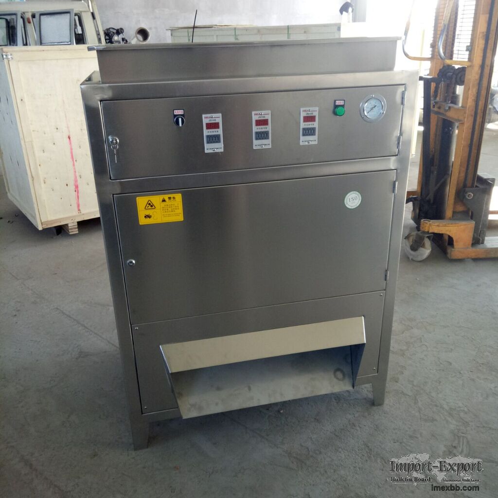 Machine Introduction: The new style dry peeling machine with high efficiency can peel the garlic without soaking. The working principle of the machine applying advanced Air Compressor technique to peel off skin naturally, which guarantees the quality of garlic cloves.Completely automatic peel operation Also can peel scallion/shallot.Useful, energy saving compact, high production efficiency, easy maintenance and clean and low malfunction rate,Automatic control and in feed device, easy to operate.Can peel different size of garlic, product meets the health standard. Suitable for complete processing line or working singly.Without damage, the garlic has long preservation.Production output according varieties from breed, season and nature of garlic Feature: a. Peeled garlic can be kept whole, fresh and clean because this machine is designed with special theory and technique. b. It can dry and peel the garlic automatically, and it is practical, power- saving, small, high-efficient, and easy to repair and clean. It also has a failure rate. c. Peeled garlic can separate from the skin automatically because this machine has automatic temperature control device and automatic transfer device. Peeled garlic can be kept for longer time since they can not be hurt during peeling.