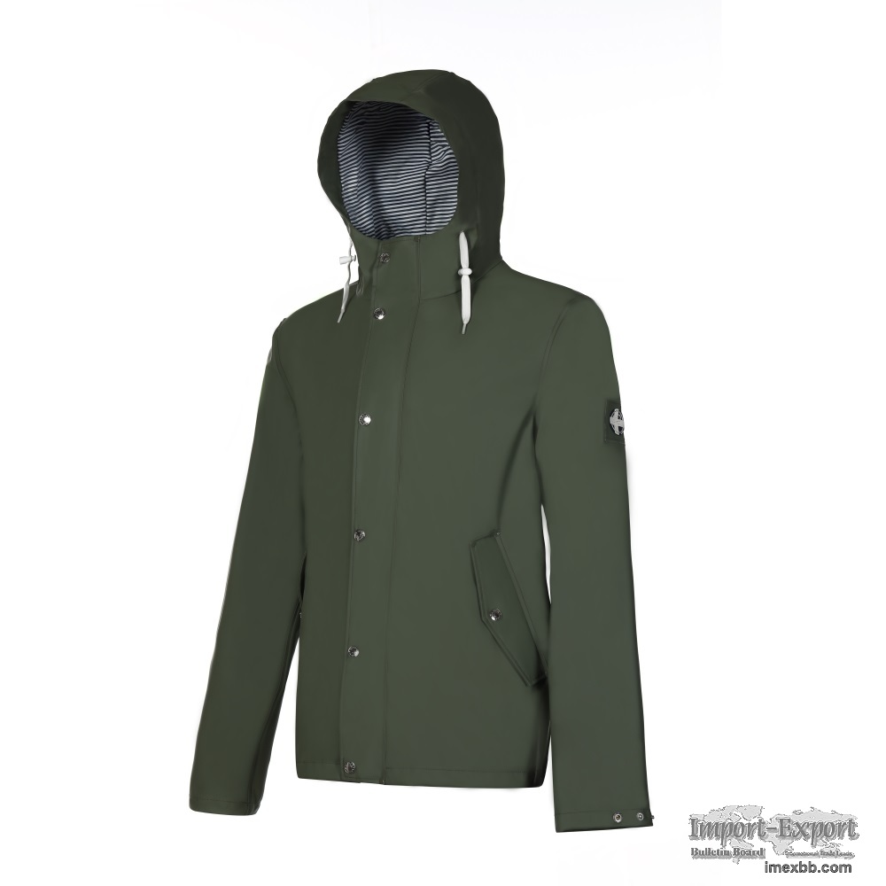 High Quality/Waterproof/Windproof/Fashionable ;Men's ;PU Rain Jacket with striped hood lining, used for men outdoor in rainy days. All seams were welded with transparent PU tape, adjustable hood by polyester/cotton string, #5 plastic zipper at CF of jacket. Back seam holes and four eyelets at each armhole make the jacket breathable.