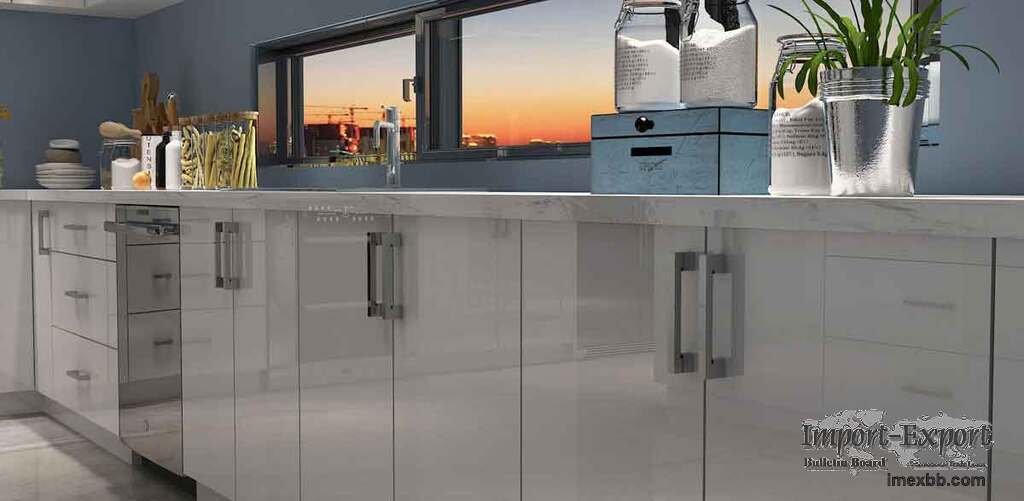 Advantages of modern kitchen cabinet lacquer paint FLAT DOOR PANEL WITH HANDLES Plain-coloured surface with super white high gloss lacquer and sliver handles finish. simple and elegant but full of enthusiasm.