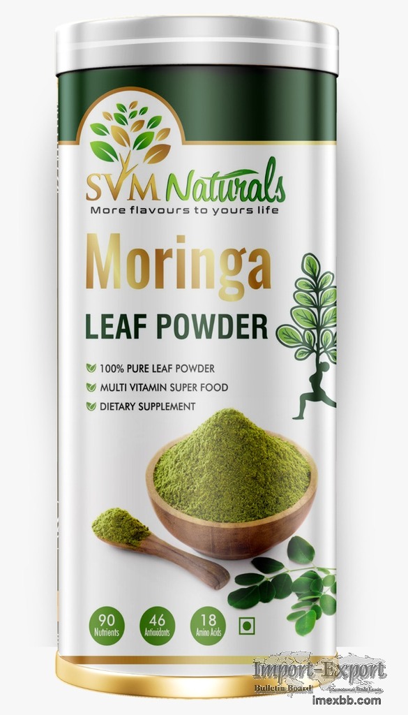 Our SVM Exports Moringa leaves are carefully washed and dried at low temperature and then powdered. We maintain the level of temperature on the process of Drying and powdering process to retain the colour and Nutritive values of Powder. The leaf powder is rich in vitamins, phyto nutrients, antioxidants, amino acids and is easily soluble in water. Botanical name:Moringa Oleifera Green, natural with Richaroma and No additives and added colors Rich in vitamins, phyto nutrients, antioxidants, amino acids Fine micro fined upto 200 mesh Germ free technology Easily soluble in water and convenient to add in any formulations Sterile packing