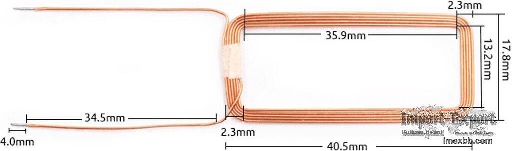 Features of NFC/RFID Antenna Wire Diameter: 0.4mm Weight: 0.7g Antenna Dimension: 40.5x 17.8x 0.5mm Frequency: 13.56MHz Specification of NFC/RFID Antenna Item Specifications Antenna Frequency Range 13.56MHz Gain 1dBi V.S.W.R ≤2.5 Impedance 50Ω Antenna size 40.5x 17.8x 0.5mm Polarization Linear Mechanical Inner Material Copper Connector type Soldering or customizable Mounting Method Soldering Environmental Operating Temperature -40℃~+80℃ Storage Temperature -40℃~+85℃ Environmentally Friendly ROHS Compliant