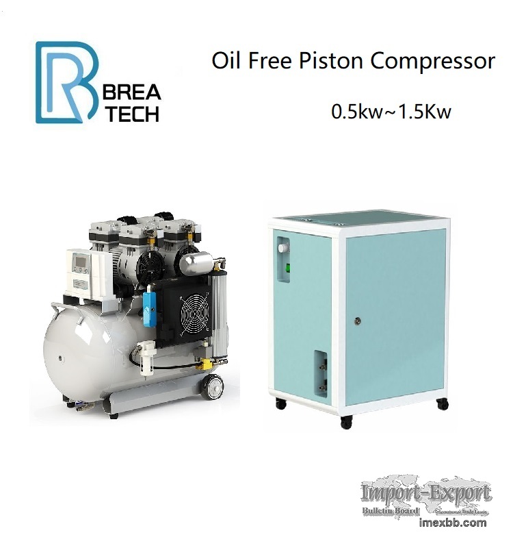 Oil Free Piston compressor Product Details Compact, rugged, and durable design of piston oil-free compressor, piston ring design that provides consistent flows throughout the service life of the unit, and high torque motors. High quality dry compressor, driven by 2 twin-cylinder engines to supply large quantities of air. Application: * Medical suction device, dental equipment * Various instruments * Automatic machine assembly * Vary kinds of machinery.