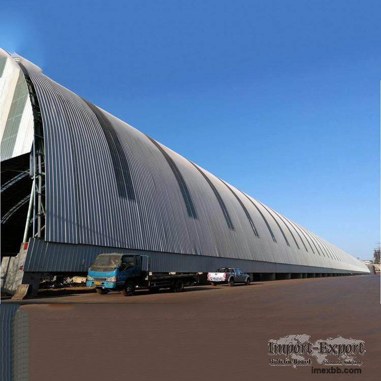 1. Total construction area: A material yard span: 410m in length, 145m in projection span and 59450 m2 in projected area; Mixing yard span: 460m in length, 92m in projection span and 42320m2 in projection area. The projected area of the shed is 101770 m2. 2. The structure and features of this project are as follows: The primary material yard and mixing material yard shed project is a closed cylindrical reticulated shell shed, which adopts a multi-center cylindrical surface positive four-corner bolt ball joint reticulated shell structure, and is closed by a steel structure. The axial spans of the space frame supports are 145m and 92m, respectively, and are supported on the top of the concrete stepped column by external chords. The elevations of the space frame are 29.00m and 48.00m respectively. The length of the space frame is 9m, the length of the space frame is 4.50m, and the space frame size in the span is 4.00m. If you have a similar project to be built, please come to consult us, we will analyze it for you for free!! website:https://www.cnxzlf.com