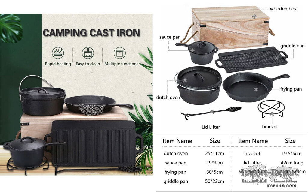 Part Size dutch oven 25*11cm milk pot 19*9cm frying pan 30*5cm griddle pan 51*23cm bracket 19.5*5cm take cover device 42cm wooden box 55*34.5*24cm Product Introduction The seven-piece outdoor set is a must-have cookware for BBQ or outdoor camping. It includes cooking utensils such as frying pans, dutch oven, griddle, sauce pans, plus matching tools, and a wooden box packaging. Complete categories, more convenient to carry. The whole set of cookware is made of cast iron, and is 100% seasoned before leaving the factory. It is ready to use out of the box. Cast iron cookware is more suitable for campfires. It is strong and durable and is not easily damaged. It is a good choice for camping. Regarding each cookware product in the outdoor suit, Shijiazhuang Sarchi Trade Co., Ltd have classic collocations. Of course, we can also deploy them according to needs. For example, the number of products in the suit can be reduced or increased, and single purchase is supported.For example, for outdoor dutch oven, we can provide three styles to choose from. For other special needs, you can contact our sales team for further communication.