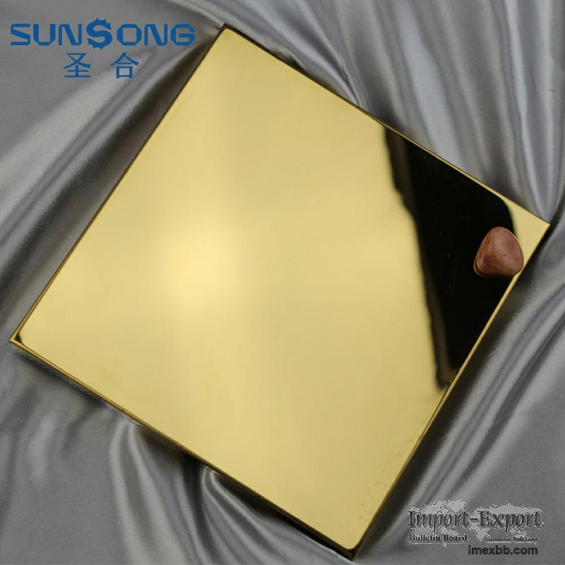 APPLICATION of SUNSONG Mirror Etching Stainless Steel Due to its beautiful appearance, the mirror sheet is suitable for decoration of exterior walls, interiors, elevators, etc. During the production of mirror sheets, it is very important to choose the suitable raw material, and we generally use TISCO, BAOSTEEL, POSCO material instead of HongWang, Beihai Chengde, Yongjin Mill. The TISCO material is with high density and low hardness whose mirror surface is nice, smooth, bright after polishing. We also have done much special work in our producing processes: Firstly, we installed the Fine grinding stone into our mirror polish production line, and it could remove the oxygen layer quite well, after this process, the mirror surface could remove water ripples and some other quality problems. Some other factories may have not this process. Secondly, we have process inspection, said to remove the sheets with scratches, kink marks before PVC coating. Thirdly, after the polishing, we have the process of washing and drying and then we do the PVC coating. (Our PVC standard is one layer of NOVACEL PVC inside with thickness of 0.07mm, and one layer of normal PVC with thickness of 0.06mm.) The PVC type could be specially produced per customers' request. Finally, our package is fumigation wooden case which is table and suitable for sea transportation. The Package could be specially produced per customers' request. What's more, we would like supply the material in middle and high-end quality to our esteemed customers. Surface Finish Supper Mirror Surface Color Can be done as Silver, Gold, Black, Gold Rose, Bronze, Brown, Nickle Silver and so on, or customer's color. Raw Material 201/304/316L/430 Material Thick 0.7 to 3.0mm Material Width ≤ 1500mm Material Length ≤ 4000mm Standard Size 1219x2438mm(4ftx8ft),1219x3048(4ftx10ft),1500/ , 1524x2438mm(5ftx8ft),1500/1524x30 48(5ftx10ft)< , br>Purchase qty The minimum quantity for 0.7mm to 1.0mm thick is 100 pcs, other thicknesses can be ordered as 50pcs one time. Purchase sample Hairline/Gold/304/1219X2438X1.0/100PCS.....PRICE/P , C