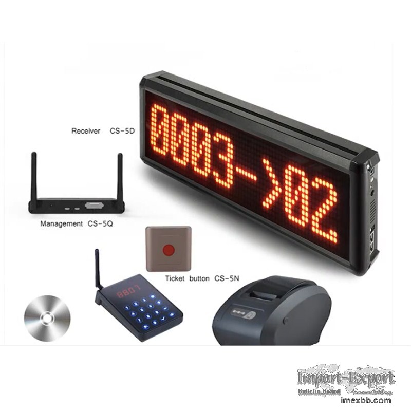 The wireless queue management system include 1pc ticket printer, 1pc touch screen transmitter, 1pc led screen display, 1pc ticket push button, 1pc management controller.