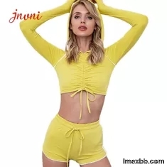 Women Wrapped Casual Solid Sets Long Sleeve hoodie Workout Tracksuit Crop Top And Drawstring Short pants Yoga Set