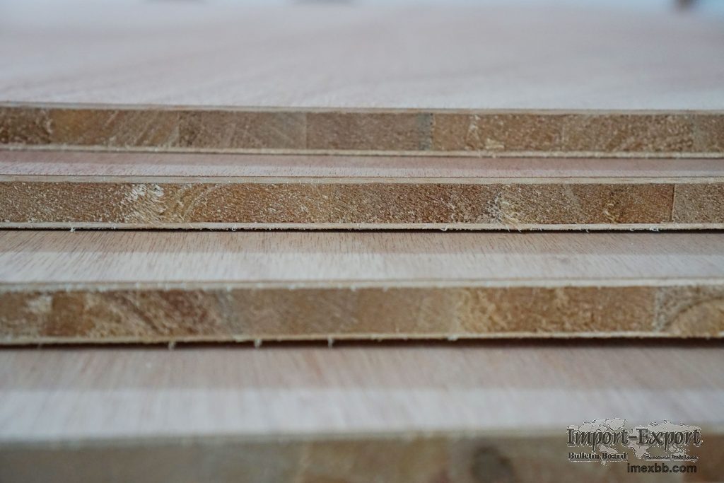 BLOCKBOARD A plywood board which veneer layers using the core are replacing by blocks of wood, the direction of grain blocks running at right angles to the adjacent veneer. Material : Albasia Falcata, Shorea Acuminata Length : 2440 mm Width : 1220 mm Thickness : 15 mm & 18 mm or by request Glue : WBP / MR / E0 or by request Finishing : Sanding or by request