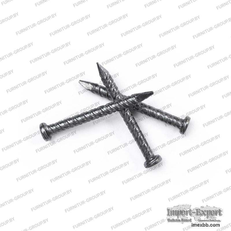 Shoe nails and wires // Shoe nails // Heel-screw nails (KVO) Heel-screw nails (KVO) are used for fastening heels in the manufacture and repair of shoes. Due to the presence of screw knurling on the shaft, screwed nails provide significantly greater heel attachment strength (up to 50%) than unscrewed.