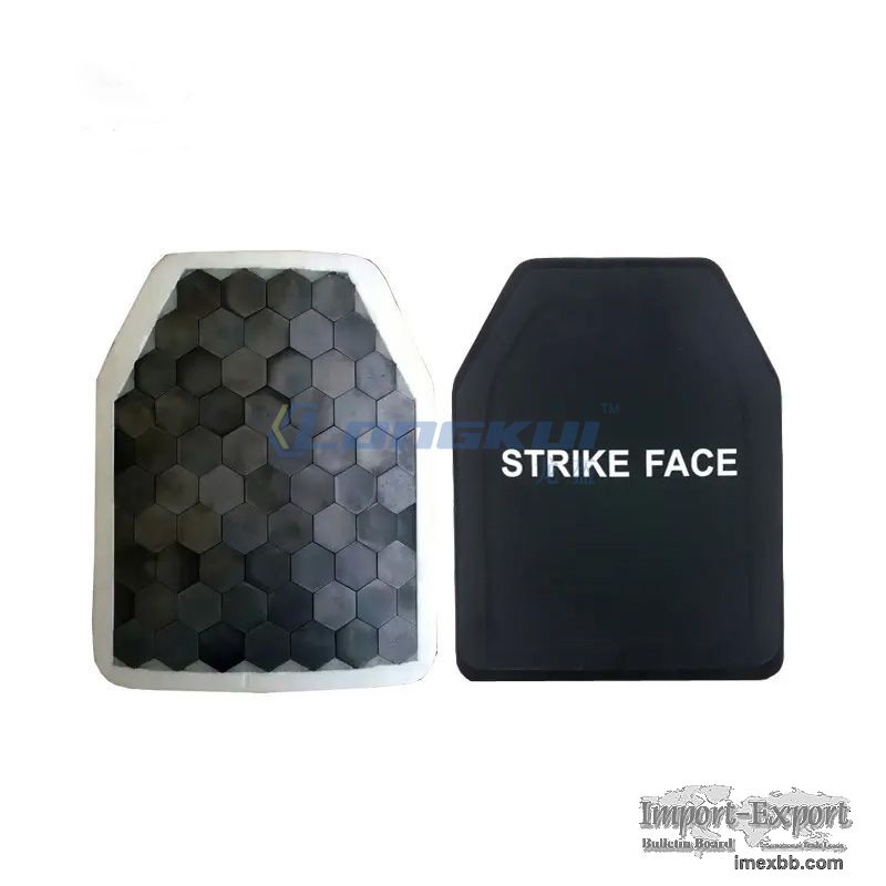 A SiC+PE ballistic plate designed for personal defense wear typically combines ceramic material, in this case silicon carbide (SiC), and polyethylene (PE) to create a protective plate designed to provide protection against various ballistic threats. Such plates are often used in conjunction with a compatible vest or carrier to create a complete ballistic protection system for individuals, including military personnel, law enforcement officers, or civilians seeking personal protection. SiC (silicon carbide): Silicon carbide is a very hard ceramic material commonly used in ballistic plates due to its high level of hardness and resistance to penetration. Ceramic materials like SiC are used to disrupt and absorb the energy of incoming projectiles, helping prevent them from penetrating the armor.PE (polyethylene): Polyethylene is a synthetic polymer known for its lightweight and flexible properties. In ballistic plates, it is often used as a backing material to catch any fragments or secondary impacts after the ceramic (SiC) has disrupted the projectile. The combination of ceramic and PE provides a balance of hardness and flexibility in the armor plate. SiC+PE ballistic plate, the ISO 9001 certification suggests that the manufacturer of these plates follows rigorous quality control and management processes to ensure the reliability and consistency of their ballistic products. This certification is an indicator of the manufacturer's commitment to delivering high-quality protective equipment. It's important to note that the specific level of ballistic protection provided by a SiC+PE plate can vary depending on the design, thickness, and the intended use. Ballistic plates are typically rated according to recognized standards like those set by the National Institute of Justice (NIJ) or other international standards, so it's important to verify the plate's specific protection level when considering its use for personal defense.