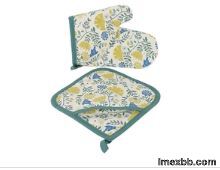 Durable coarse fabric on the surface of the oven mitt and pot holders provide a secure non-slip grip while handling pots and pans.