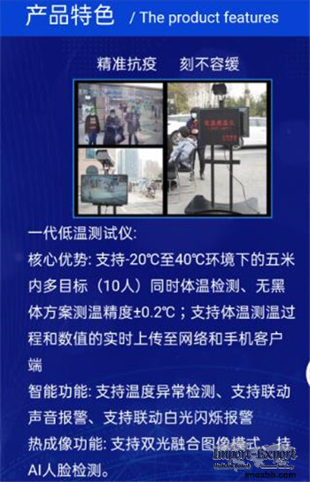 Thermal Body Temperature Measurement Camera Solution ADVANTAGES Core advantages: At the same time, it supports multi-target (10 people) temperature detection within 5 meters under the condition of - 20 ℃ to 40 ℃, and the temperature measurement accuracy is + / - 0.2 ℃; it supports the real- time uploading of temperature measurement process and value to the network and mobile phone client, and real-time video recording is conducted for 3 months. Intelligent function: It supports temperature anomaly detection, linkage sound alarm and linkage white light flashing alarm Thermal imaging function: Uncooled detector, resolution 160 × 120 (default 320 × 240 output), support agc4.0, DDE, 3dnr, dual light fusion image mode, support AI face detection. Visible light function: 4 million star level 1 / 2.7 inch high performance CMOS; maximum resolution up to 2688 × 1520@25fps Visible light supports low bit rate, low delay and ROI enhancement coding, supports 3D digital noise reduction and supports 120dB wide dynamic. Infrared related: support smart IR, support the opening and closing of over exposure of light supplement, support automatic and manual control under the opening, manually support the brightness control of fill light according to distance level, support independent configuration of two sets of parameters day and night, and support temperature detection within 5 meters under low temperature.